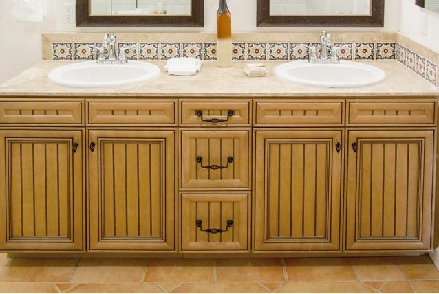 This bathroom beautifully showcases traditional Mexican craftsmanship with a vibrant Talavera tile backsplash and warm Saltillo tile flooring. The hand-painted Talavera tiles add bursts of color and intricate patterns to the walls, while the earthy tones of the Saltillo tiles provide a rustic and inviting foundation.