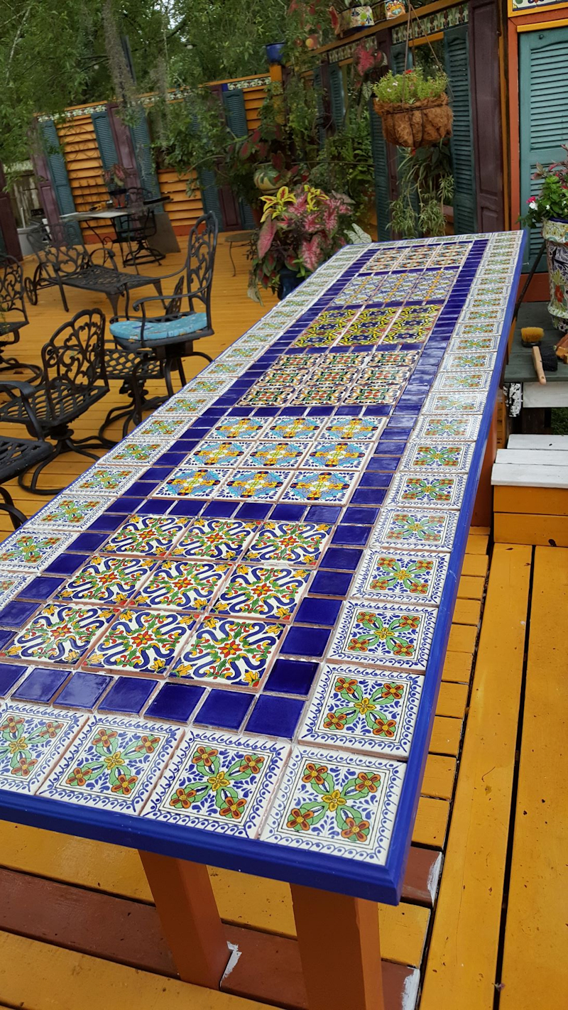 A colorful outdoor patio featuring a long table topped with vibrant Talavera tiles in blue, green, yellow, and orange patterns. The table sits on a bright wooden deck surrounded by wrought iron chairs, lush plants, and shuttered walls, creating a warm, Mexican-inspired garden setting.