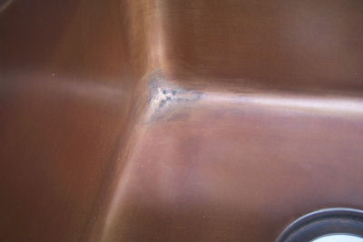 This is a special kitchen sink. It is the first sink of a new collection we are introducing. This new sink features a smooth surface and a weathered finish while still keeping the antique-looking appeal. The copper sheet is 16 gauge (0.05" thickness).